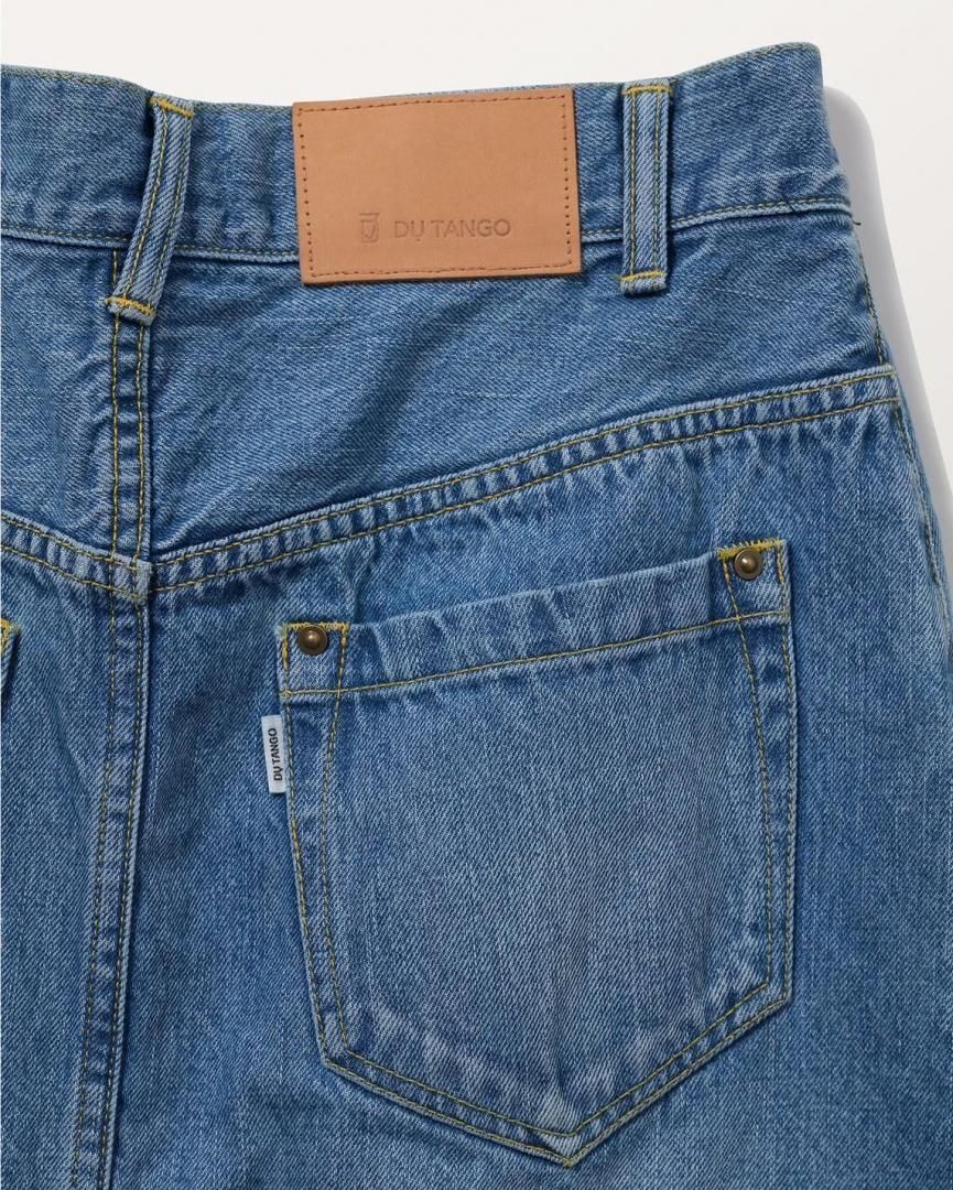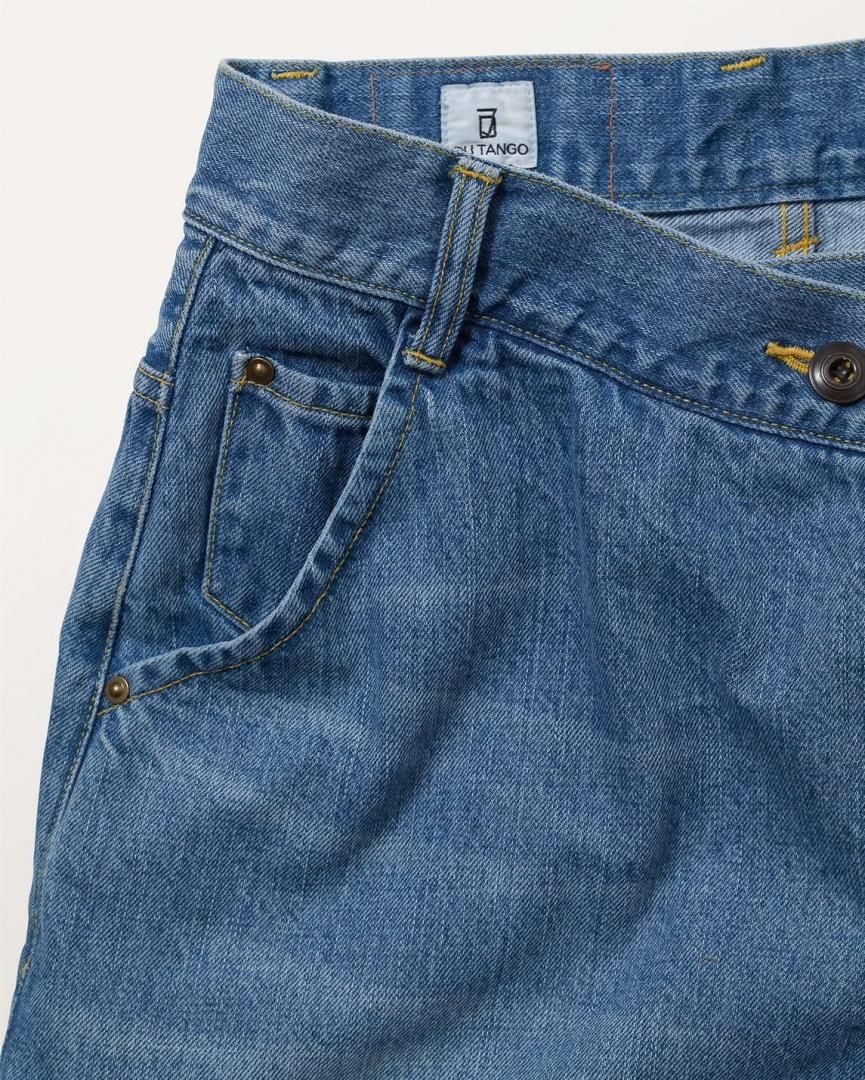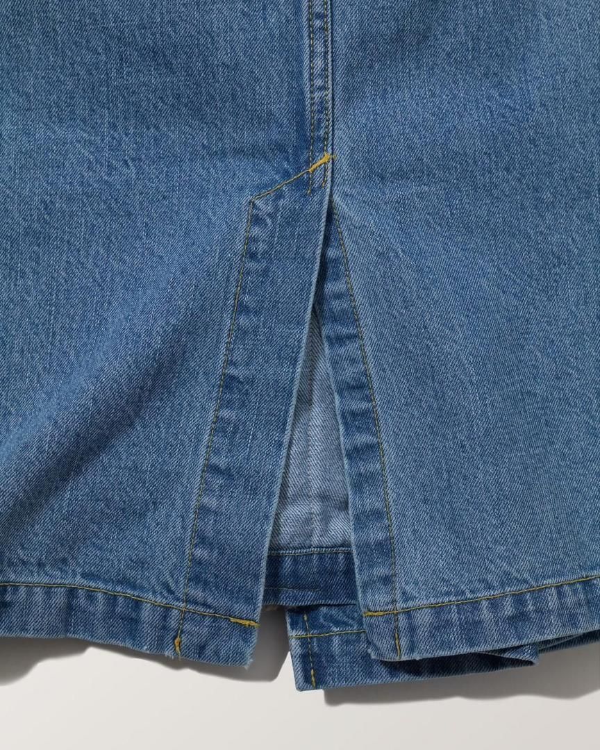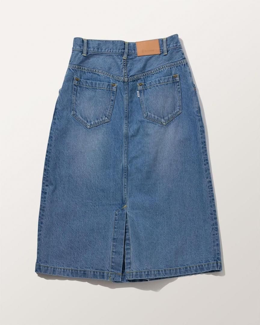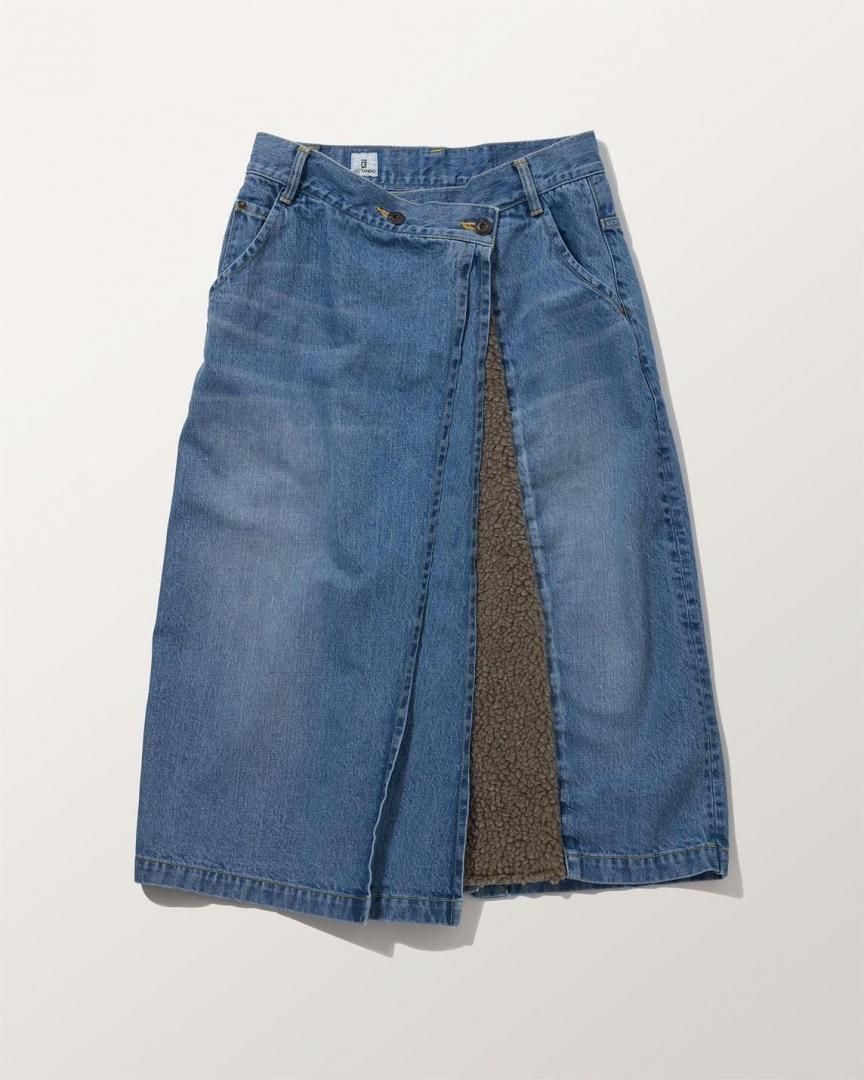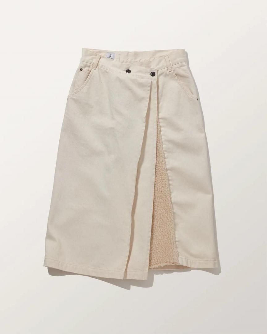 フロントの重なりにウォーミーなボアをコラージュした暖かみのあるジーニングスカート。ラップ仕様ではなくすっぽり穿けるデザインは、釦位置やベルトでウエスト調整が可能。生成り、インディゴ共にムラ糸のオールドデニムを使用。生成りはワンウォッシュ、インディゴはヴィンテージ加工仕上げ。