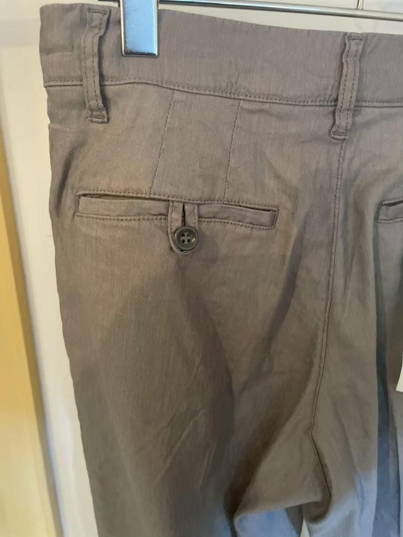 ウエストの内に紐を施しサイズ調節がしやすいよう工夫を凝らし、バックポケットはループボタン風にデザイン。